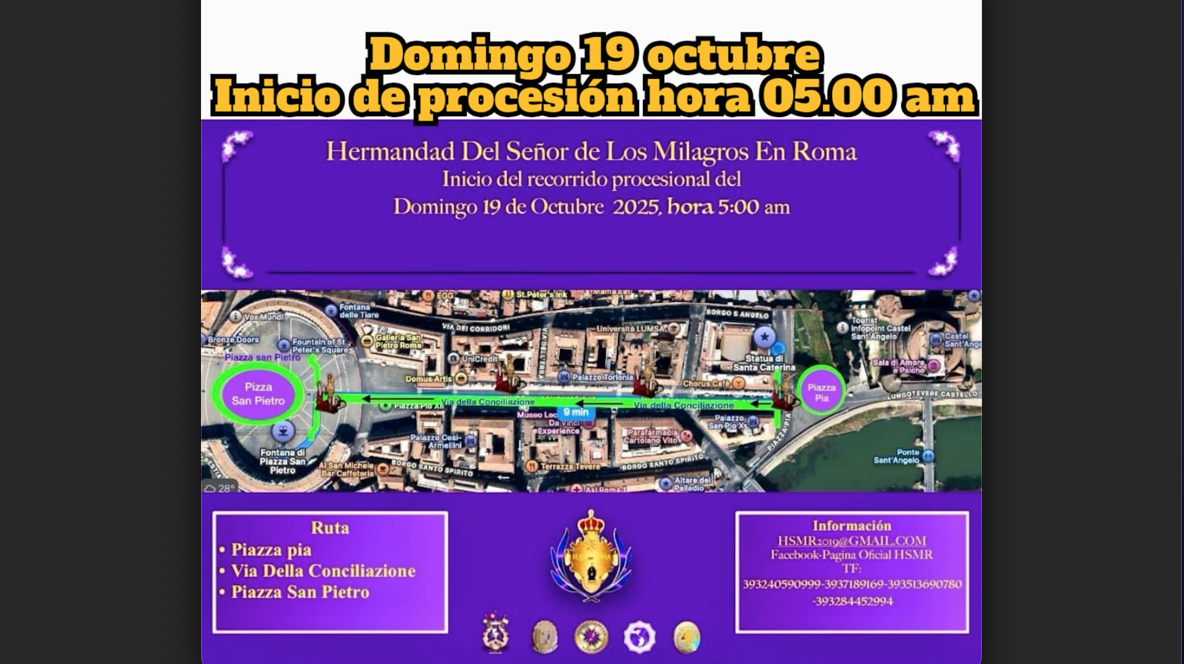 3 de octubre de 2025Organizada por la Hermandad del Señor de los Milagros en Roma con participación de cientos de devotos de hermandades de ciudades alrededor del mundo, procesión recibirá bendición del Papa León XIV