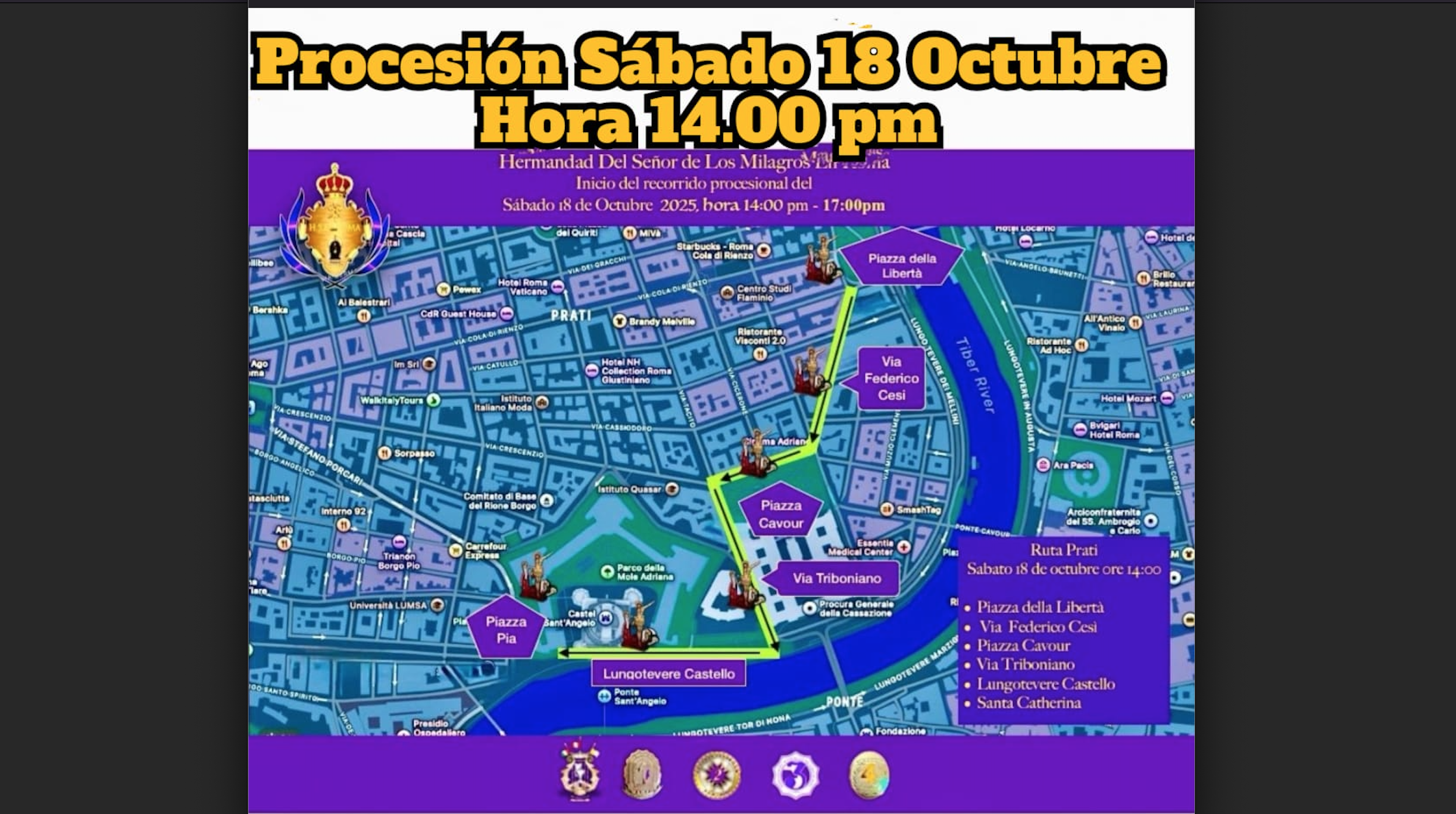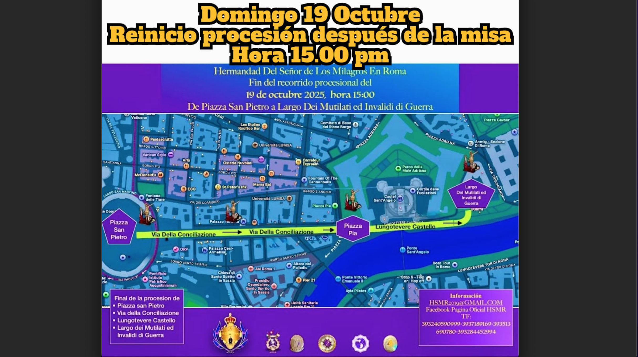 La Embajada del Perú ante la Santa Sede se complace en informar que una gran procesión del Señor de los Milagros y Santa Misa se llevarán a cabo en Roma el sábado 18 y domingo 19 de octubre de 2025 en el marco del Jubileo 2025. Organizada por la Hermandad del Señor de los Milagros (HSM) de Roma, la gran procesión contará con la participación de cientos de devotos de las HSM de comunidades peruanas residentes en distintas ciudades alrededor del mundo.